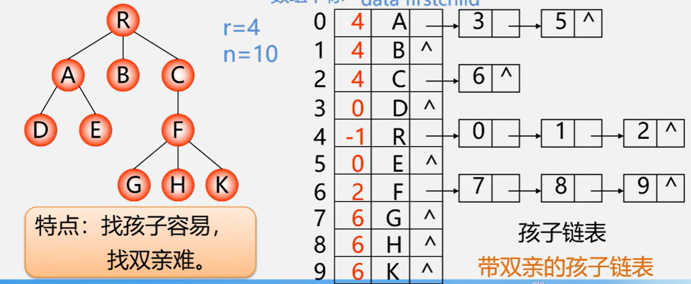 把每个结点的孩子排列成单链表,再将每个结点存入顺序表中,顺序表中每个元素的指针域指向该结点的孩子组成的链表的头指针